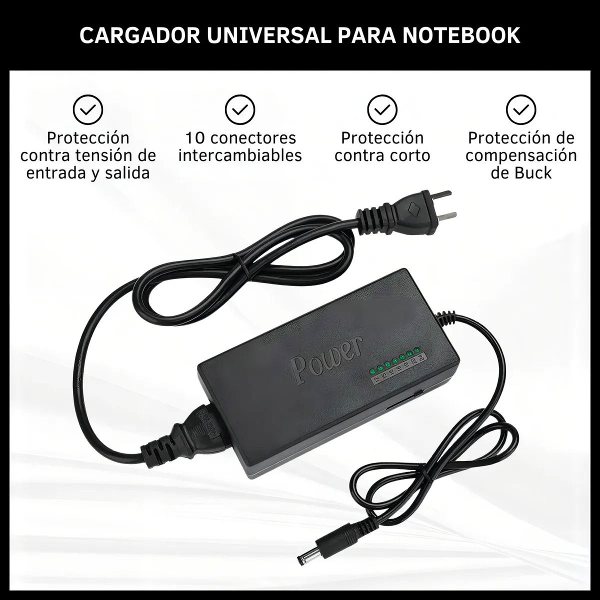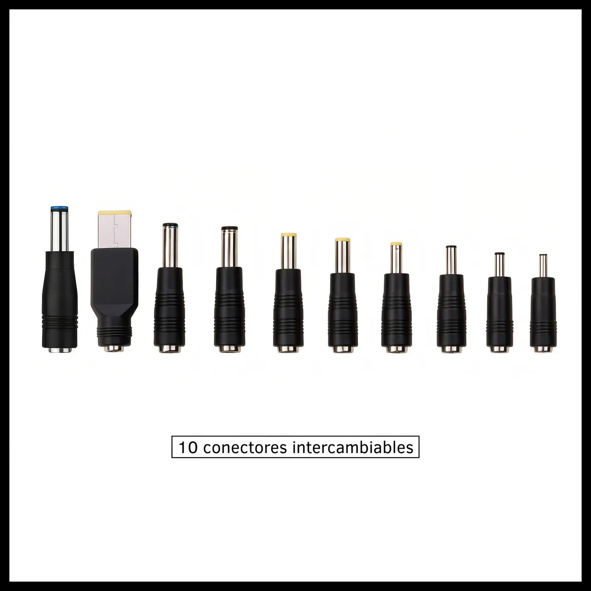 Este cargador universal para notebook con 10 conectores intercambiables cubre una amplia variedad de modelos y marcas. Incluye un selector de voltaje ajustable entre 12V y 24V, lo que permite adaptarlo fácilmente a las necesidades de cada equipo. Y además incorpora sistemas de protección para garantizar un uso seguro y confiable.