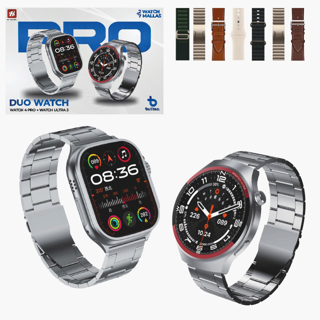 El Set BULLTEC DUO WATCH ofrece la combinación perfecta de tecnología, estilo y versatilidad. Incluye dos smartwatches de última generación (Watch 4 Pro y Watch Ultra 3) junto a 7 mallas intercambiables, ideales para adaptarse a cualquier ocasión. Con múltiples funciones inteligentes y un diseño moderno, es un pack premium perfecto para uso personal o como regalo.